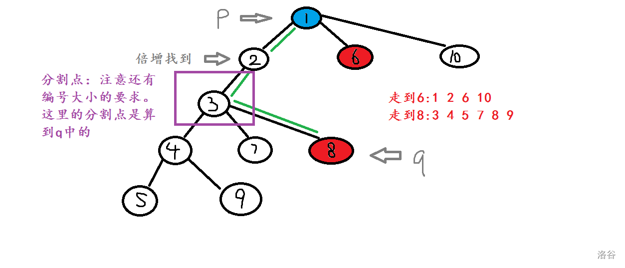 我们倍增找到对应上来的的儿子(2),以及分割点(3),那么此时都算到的答案中,也就是;此时算到中,也就是