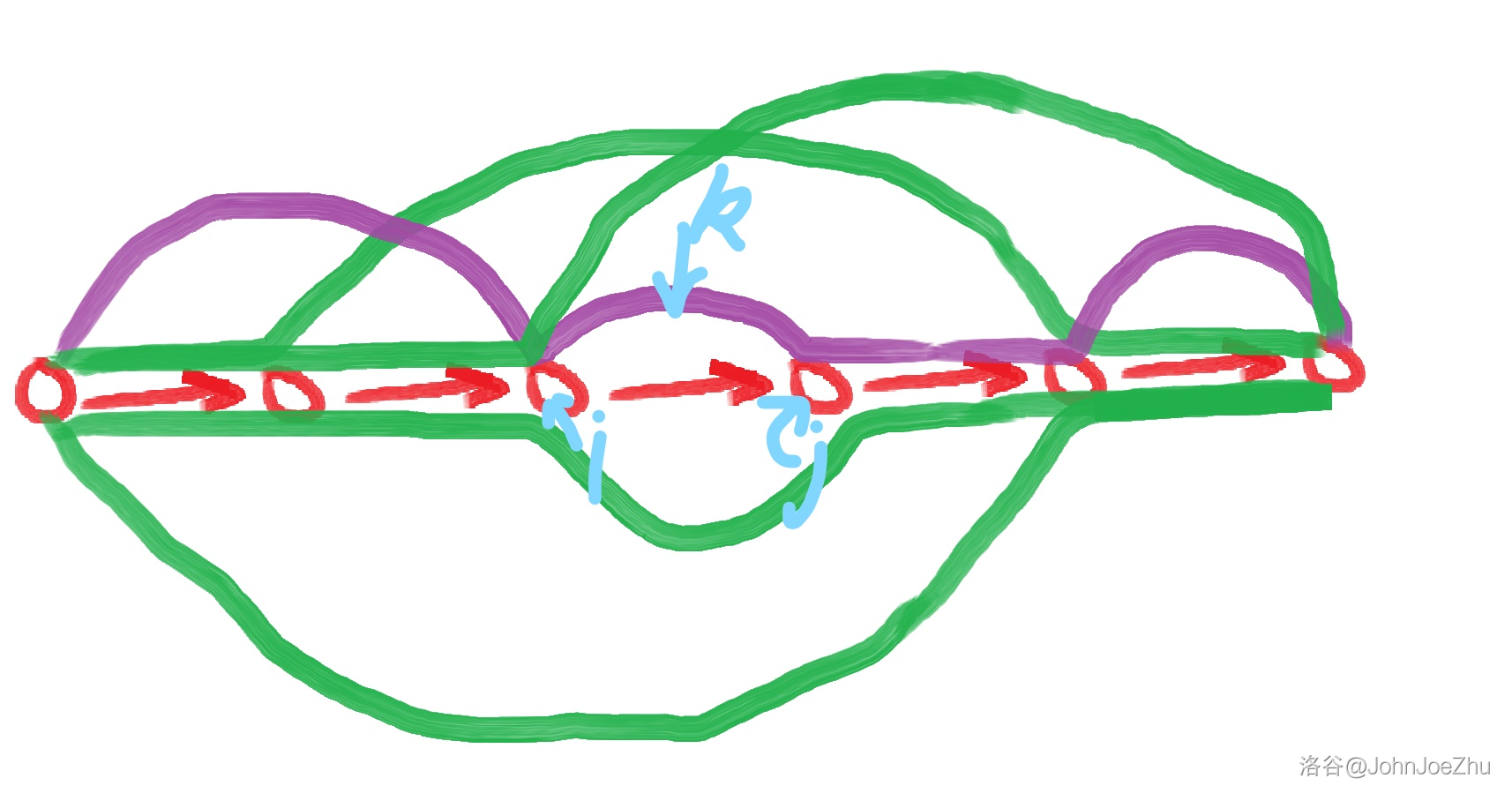 显然,如果我们走路径k,那么对于最短路i到j,就会有更优解路径k来代替原来的路径,那路径k就成了最短路了