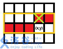 利用补集转化的思想,把问题转换为求没有任何一个子矩阵满足匹配条件的棋盘的种数。最后的答案即为。 使用轮廓线解决这个问题。设表示当前考虑到第行第列,上面的轮廓线状态为,矩阵第一行匹配的位置为,第二行匹配位置为的方案总数。(轮廓线状态表示当前点能否匹配到模板串第一行的末尾,也就是和下图红色区域的匹配状态)