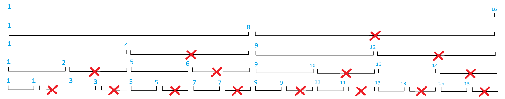 不难发现,有些区间是没有用的。例如 ,可以用 的值减去 的值得到。图中画叉号的区间都是可以删掉的。
