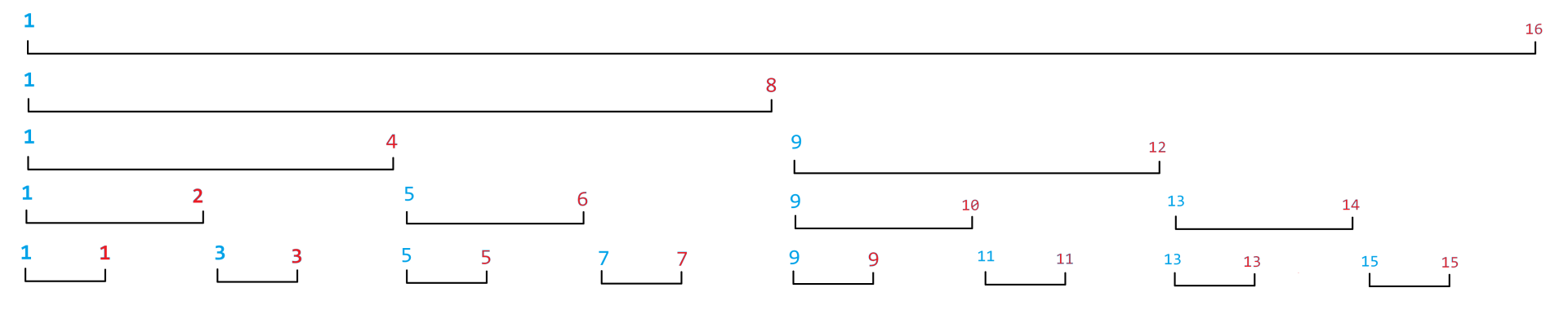 上图是一个树状数组的图示。对于每一个区间 ,代表的是这个区间的和。如果想要访问一个区间 ,那么就要从最大的区间开始,逐级划分,然后加和(类似于线段树的思想)。