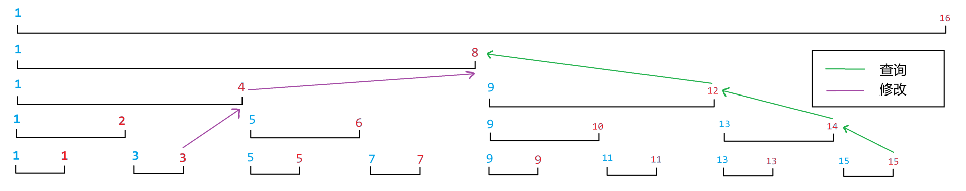 现在想要修改点 的值,使其增加 。那么相反, 每次需要向后移动 位,即 ,然后修改 。一直向右移动直到移动到大于或等于 的点停止,保证每个包含该点的区间都被修改。