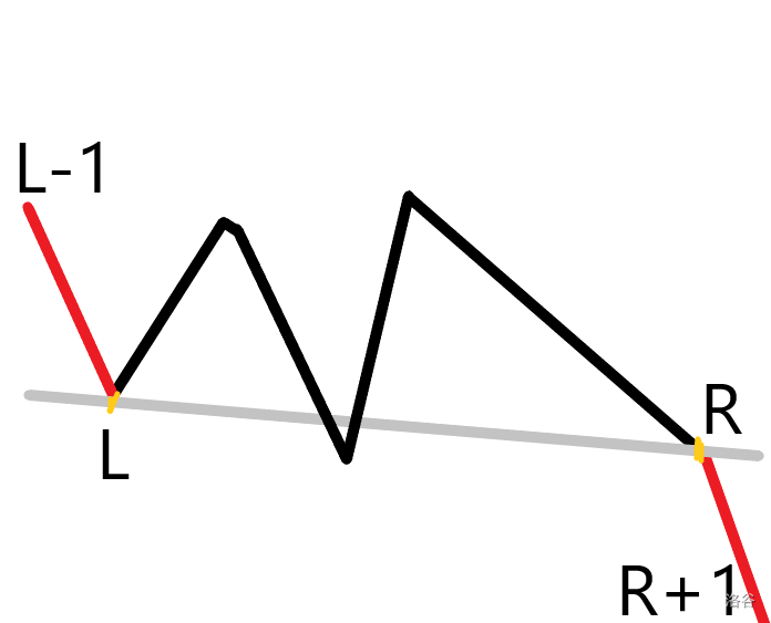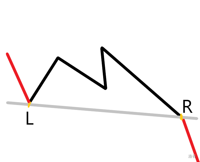 - 如果 之间的部分和直线 有交点,无解。看图可以看出,当要同时照亮 和 两边时,光线会经过与未照亮部分与直线 相交的点,所以也无解。