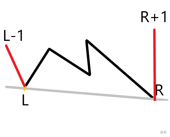 对于一段连续的不能被照亮的区间,如图(红色表示能被照射到,黑色表示不能被照射到):