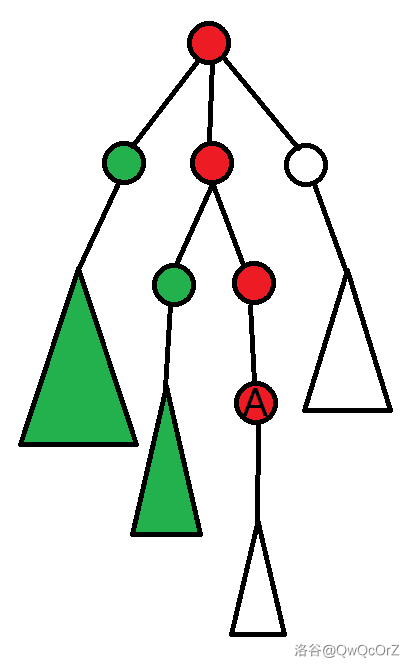 其中三角形表示子树,圆形表示节点, 点为当前处理到的点,红点为压入状态 的点,绿点为要求被覆盖的点,白点为还未处理过的点