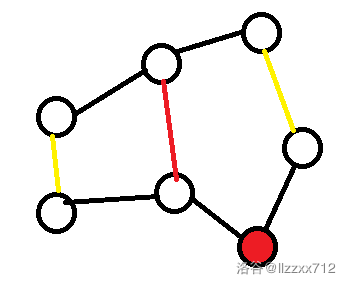 如图,我们从红色点开始走,黄色边为新修建的边,红色边为重叠边,易知红边要走两次。 所以在计算答案的时候我们需要将重叠边减去或是不选重叠边,因此我们可以将第一次求的直径取反这样如果选到了原直径上的边就相当于减去了这部分,保证了答案正确。这也就是我们刚才需要用dfs求直径的原因。