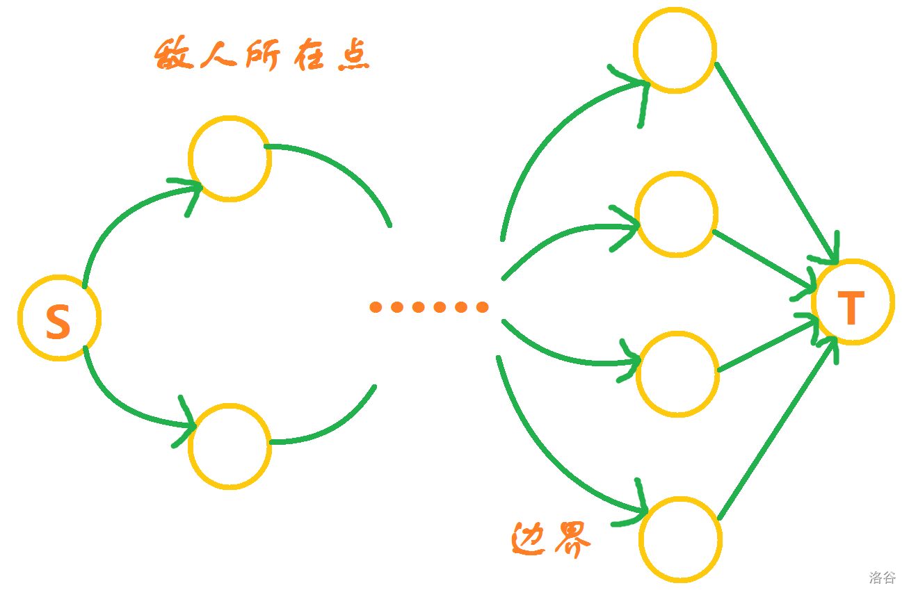 中间可能较复杂的部分先不想,我们就是想把 和 之间使用最小的代价砍断使二者不可达(建立超级源点和超级汇点是因为可能有多支敌军,同时边界的点也不止一个)。