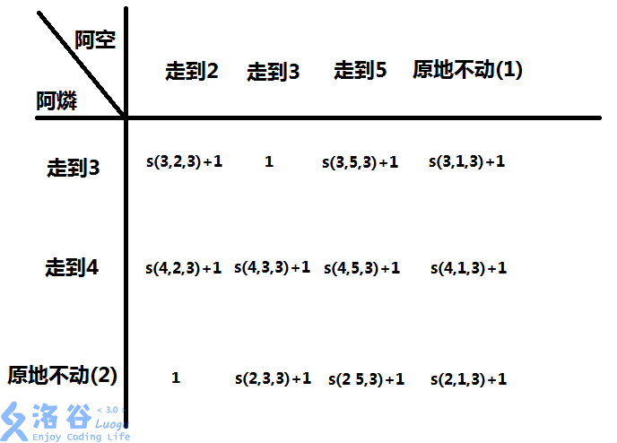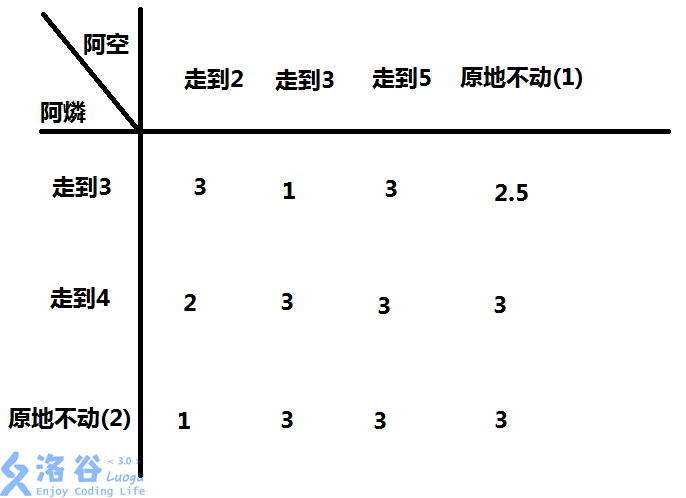 这种情况下,阿空选择原地不动显然严格劣势于选择走到2或者3,因此阿空可能的选择有两种。
