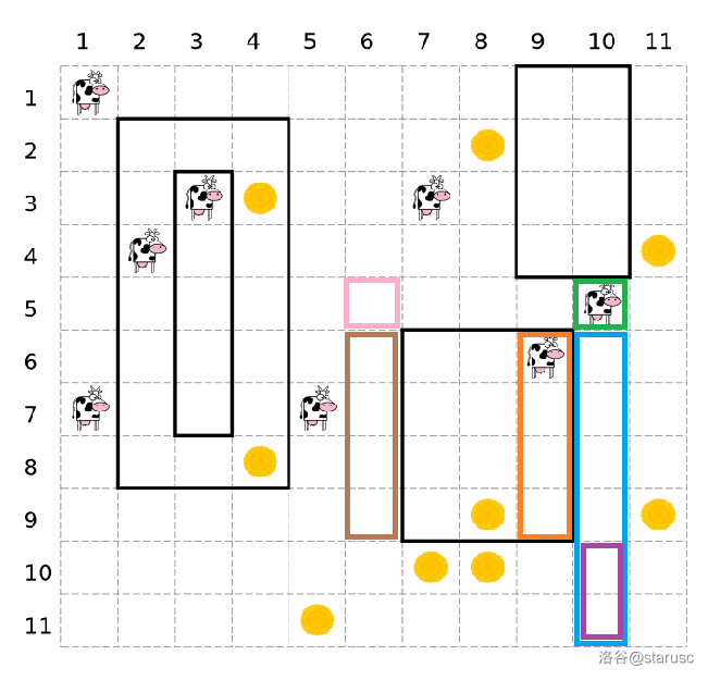 删除左区间时把棕色区域清零(会被栅栏挡住),并在粉色点减去紫色区域的值(去掉两条栅栏后,粉色点可能先下后右,或先右后下,会算重,所以减掉去重)。
