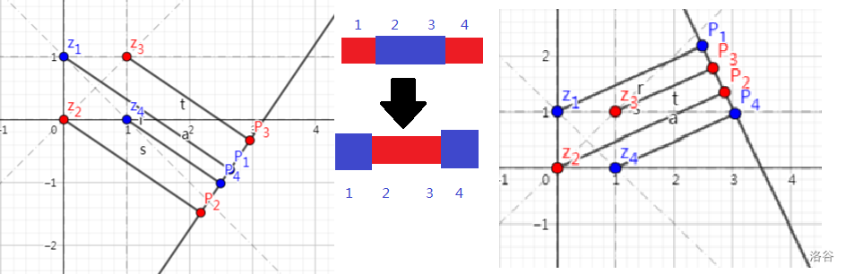 考虑动态维护这个序列。找出这 个点间的所有连线,当 垂直于连线时,就交换连线两端的点对应的颜色。看下面这张图就可理解。