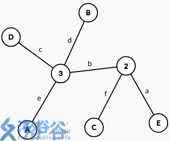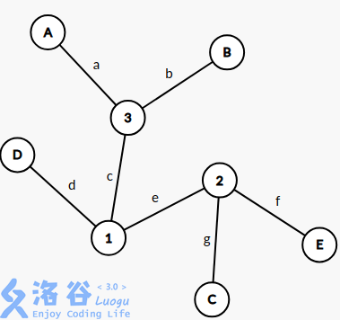 由树的联通无环性可知AB与DE有且仅有一条路径相连,C与DE直接相连的情况如下图: