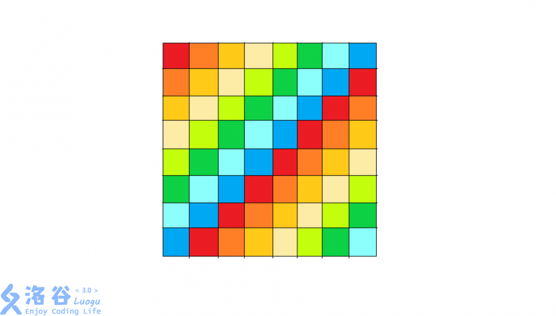 证明的话就是把这个矩阵复制几份拼在一起,如果循环节不是那么在两个矩形的交界出会出现副对角线颜色不同的情况,而循环节是的时候相当于一堆正方形拼在一起自然不会出现问题