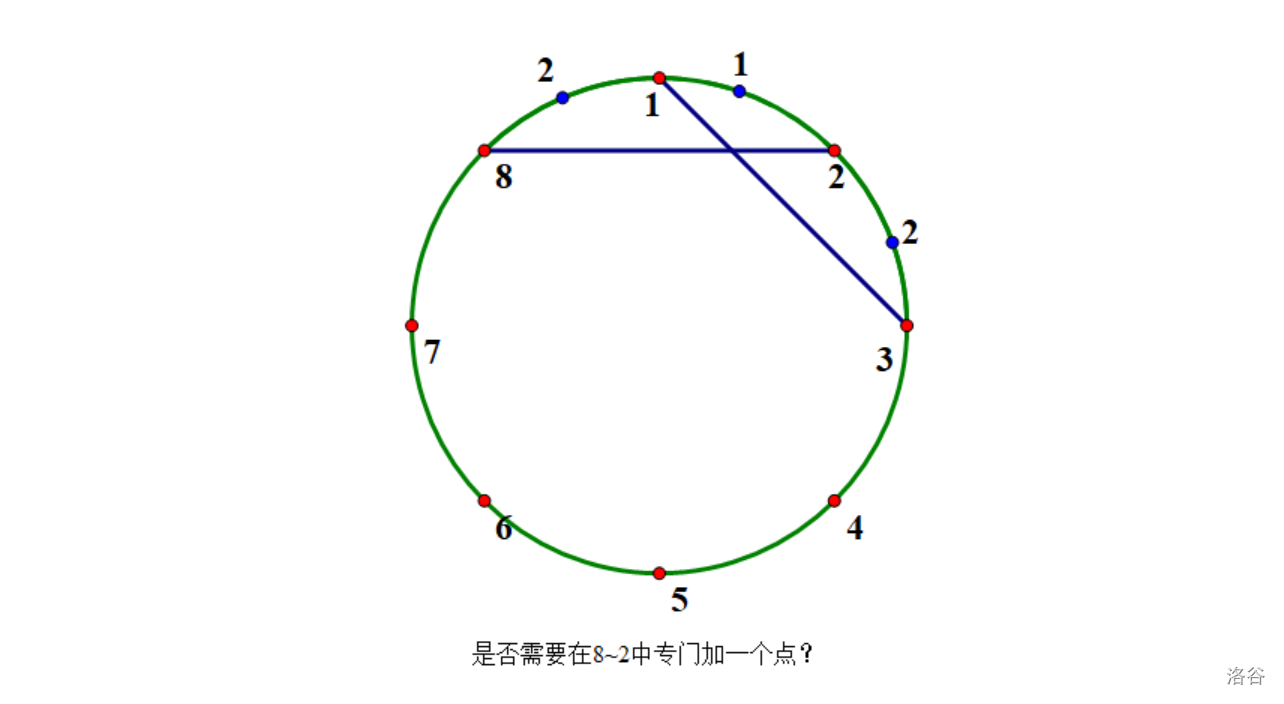 不妨设最短点对是,并记连接与(意义下,下同)的弧编号为。假定我们选择从(弧)处断开,那么由最短性可知的弧无需断开,因此仅需考虑的弧。这个问题的做法可以贪心(断开处必选,其余位置尽可能后移),考虑维护这个贪心。