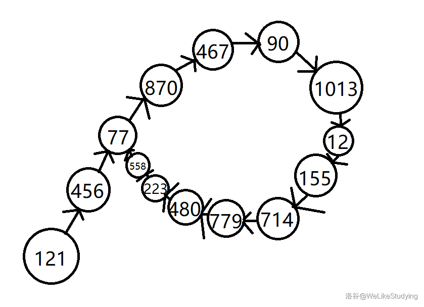 - 没错,显然这种伪随机数一旦出现相同的就会循环,而由于数据范围固定,很容易进入循环,形成混循环(即rho形结构)(我之前的数据经过特制,使得环长较长,实际环长还要更短)(如图 ),如果进入循环还一直不停地检查就太傻了。