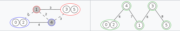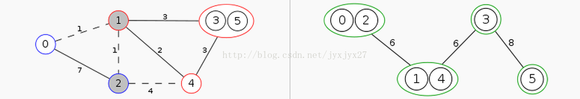然后,因为1和5已经无法连接了,所以我们可以把1和5再分成两个集合,中间由一条边连接,这条边的权值为两点之间的最小割。然后,我们再对每个集合进行这样的操作(注意,最小割要在原图上跑),再分下去,直到集合内只剩一个节点为止。如图: