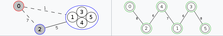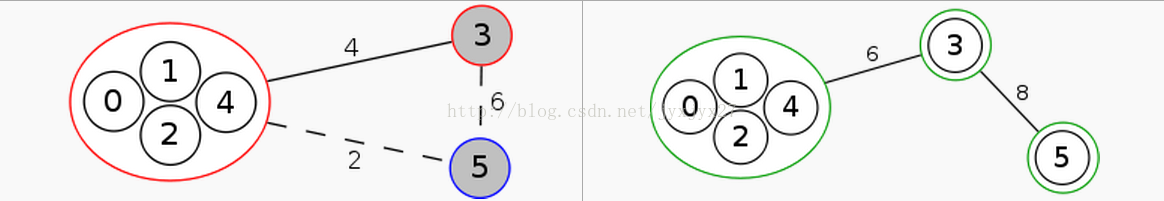 先建立一个无向图,然后再把这个图的整体看做一个集合,然后任意选择两个点(设它们为1和5),在原图上跑一趟最小割。如图: