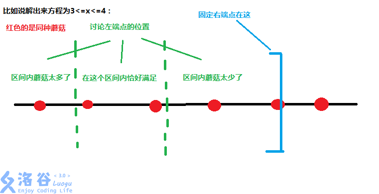 也就是说如果固定,左端点只要在某个区间内就能获得这种蘑菇的贡献。