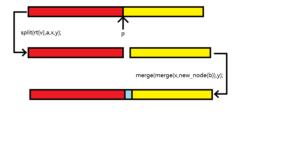 在第p个数后插入数x,就是把p拆下来然后再使用两遍merge,将它们粘在一起。