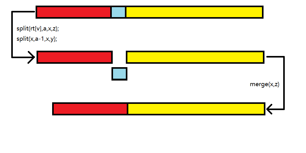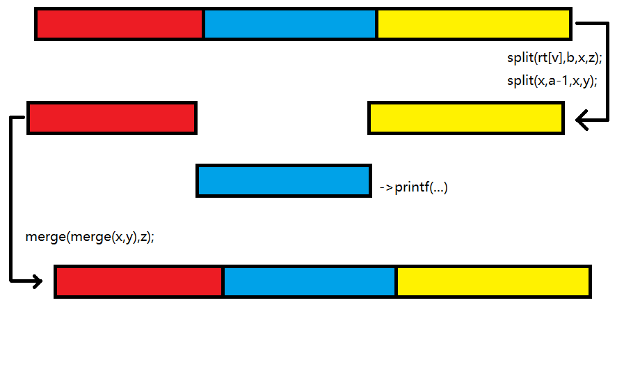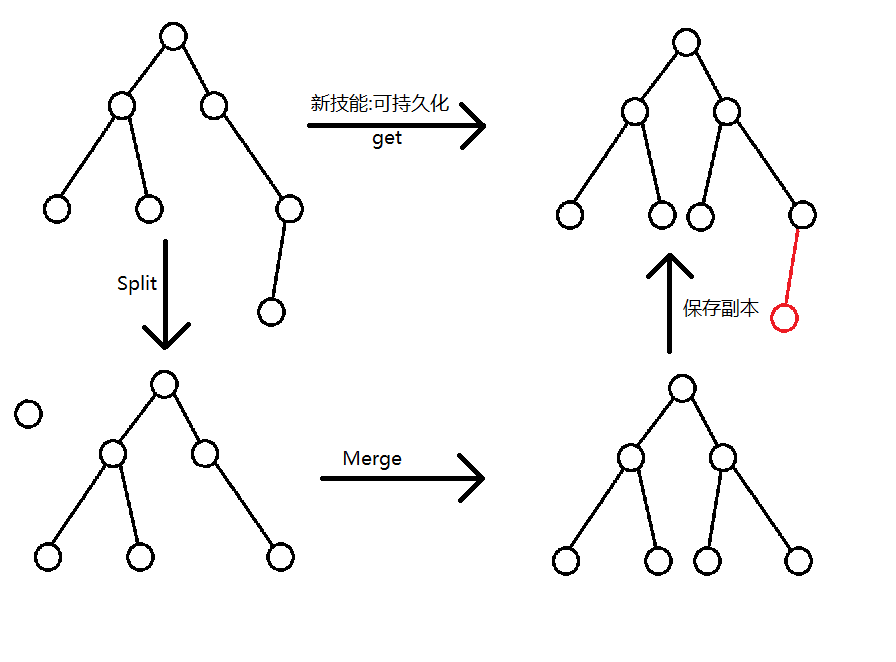 Split操作完整代码:void split(int p,int k,int &x,int &y) { if(!p){x=y=0;return;} push_down(p); if(tls(p).size<k){x=copy_node(p);split(rs(x),k-tls(p).size-1,rs(x),y);push_up(x);} else{y=copy_node(p);split(ls(y),k,x,ls(y));push_up(y);} }6.合并(Merge):
