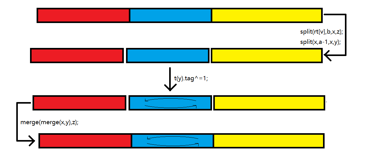注意:传之前的点别扔了,留着可持久化呢。inline void push_down(int p) { if(!t(p).tag)return; if(ls(p))ls(p)=copy_node(ls(p)); if(rs(p))rs(p)=copy_node(rs(p)); swap(ls(p),rs(p)); if(ls(p))tls(p).tag^=1; if(rs(p))trs(p).tag^=1; tree[p].tag=0; }5.分裂(Split):