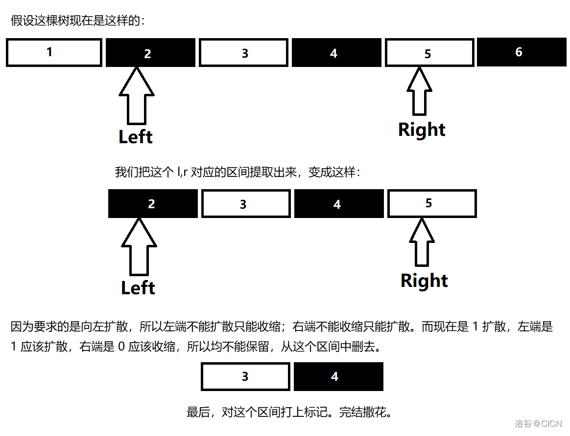 但是我们注意到两点:1. 如果有两个连续的同色子段,会同时扩散/收缩,但显然其中一个不应该扩散/收缩;2. 有可能产生长度为 的子段,此时无法在打标记之后快速更新区间和。