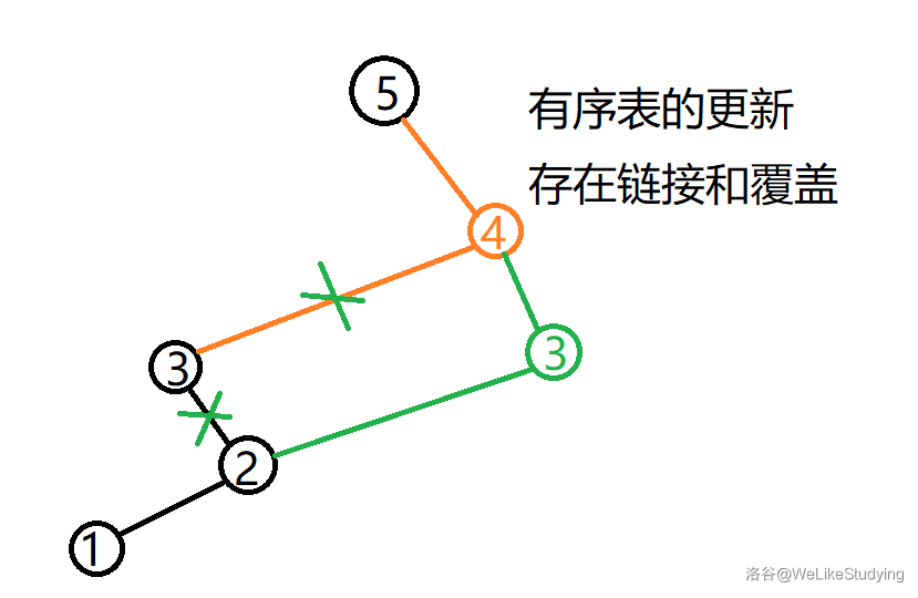 - 由于想到我们要维护的是连续段信息,我们很容易想到维护一个类似链表的结构,每个点的前驱和后继代表它在值域上的大 数和小 数的前于扫描右端点 的最后位置(不存在即为空),有序表的更新存在链接,也存在覆盖。