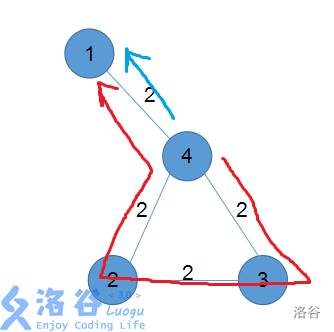 (这也是这道题一个大坑:假设我们要从 到 ,那么其实是有两条路的: