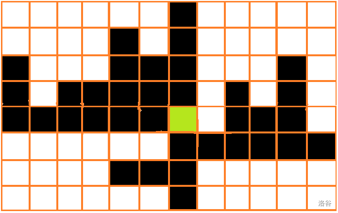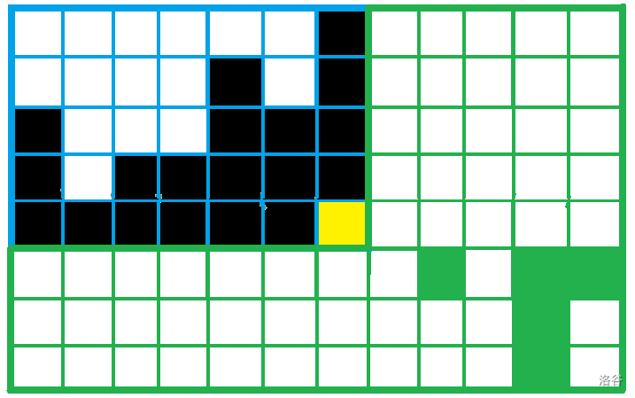 绿色点为当前点,它左上方的相连的黑色格点构成了一列一列连续的矩形(与《最大矩形面积》的原图一样)