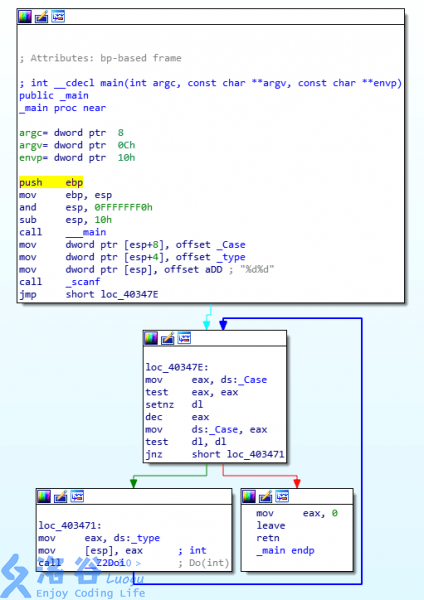 call)了一个没有任何卵用的__main函数,然后scanf读入了两个int(我们姑且称它们为 和 , 为要执行的子任务类型, 为数据组数)……然后循环调用Do函数 次,最后return。那我们继续追踪Do函数:
