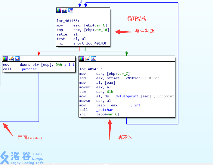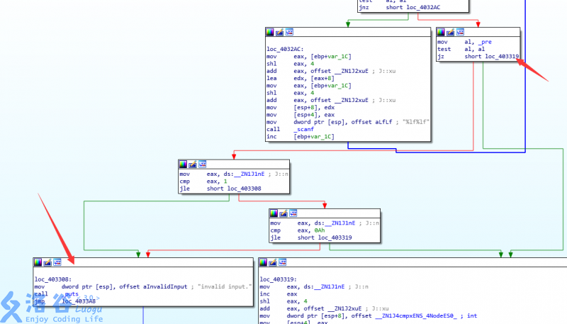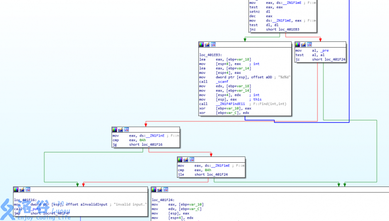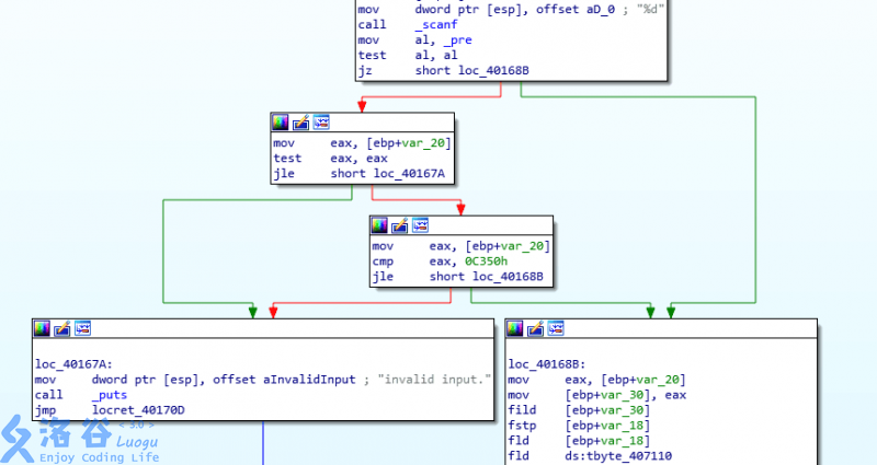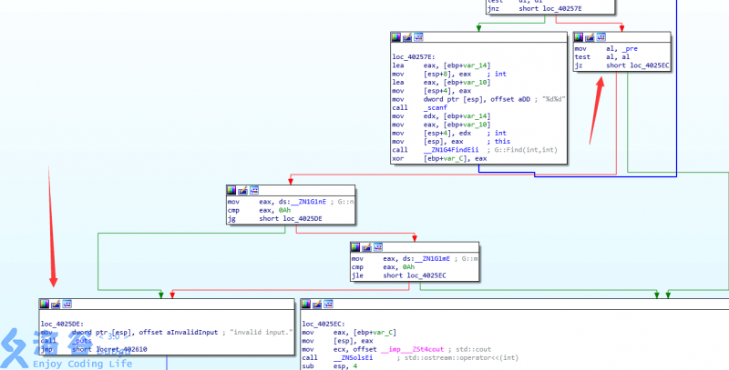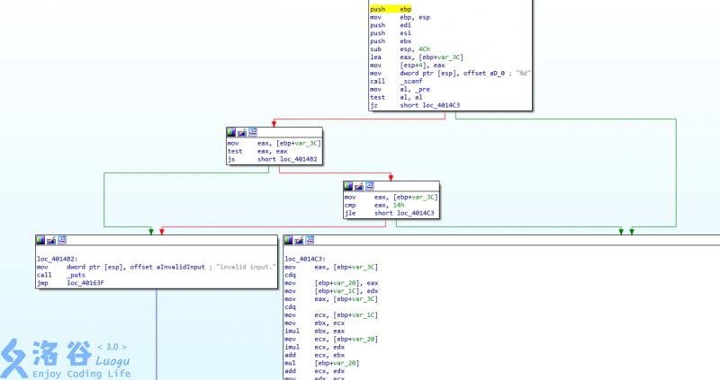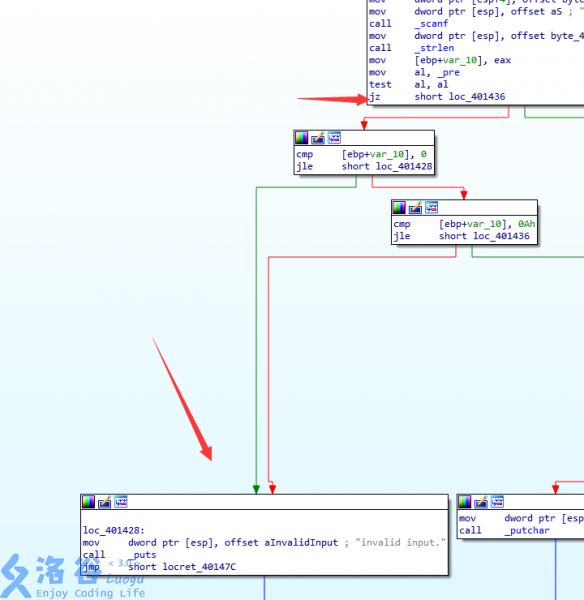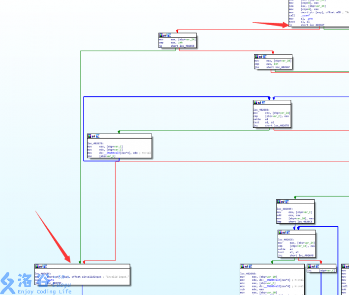 我也看不懂流程图能看懂就行,赫然入目的是最左面的结构中的一个字符串invalid input!我们追根溯源,发现带领我们进入这干扰我们切题的毒瘤恶魔的一句话是最上面的框框里的最后一句话:jz short loc_4014C3解释一下这句话,