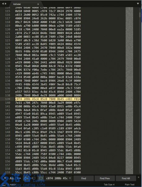 jz指令对应的机器码为74,也就是说阻挡我们的指令的真正面目其实就是74 20!jmp指令的机器码为eb,我们只要把74改成eb就 OK 了。用支持 进制的编辑器打开lost.exe(我用的是 sublime),Ctrl+F 查找这一行。注意,在 sublime 里,要 个字符一组,而且大写字母要变成小写字母,也就是说你需要在查找框内输入的应该是:c074 208b 45c4 85c0 7808 8b45 c483 f814