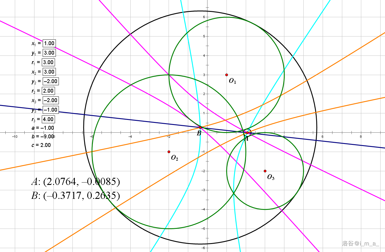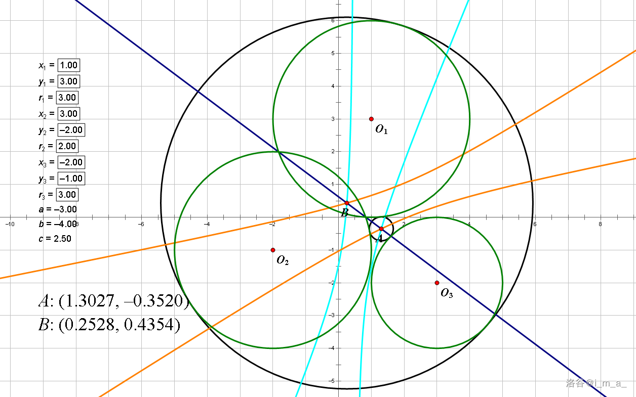 然后我想了一下,一般情况需要求3条双曲线的交点(根据性质,应该至少有一个公共交点),也就是解二元二次方程,而且消元很麻烦,就放弃了