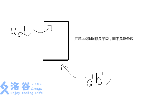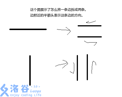首先,我们将一条边拆成两条边:上和下(或者左和右),然后分别都标上号。