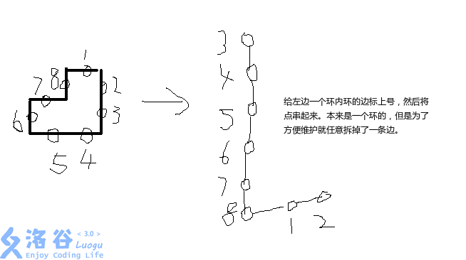因为我们没有什么东西能够很好地直接维护整个环,因此我们考虑拆掉环上的某条边。注意因为我们要求的是两条边之间的距离,因此我们给每条边建一个点,而原来的点不予维护。这里拆掉的边指的是边与边相交的边界。