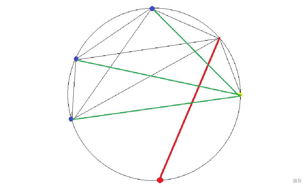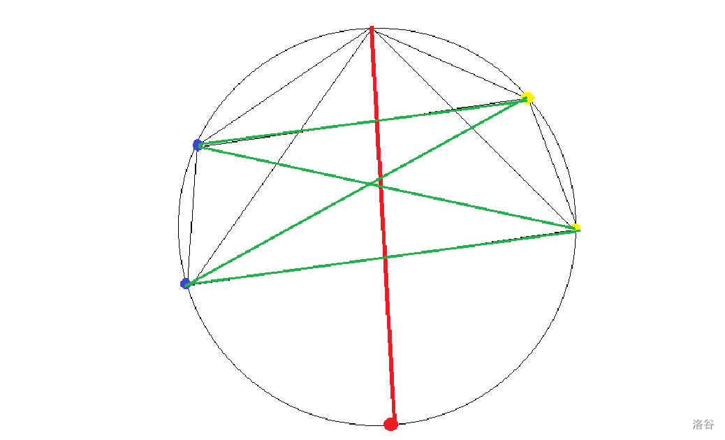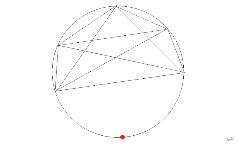 单独看一条线,它会把圆分割成两个区域(这里称为 和 )。 和 中的点需要两两相连,一定会与这条线相交,所以这条线会与 条线相交,也就会多分割出 块区域。(这里 指 中点的个数)
