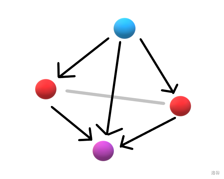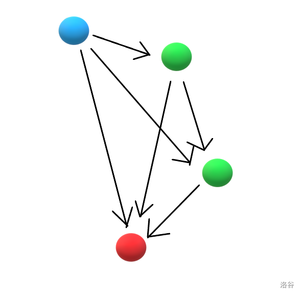 我们知道,由于一个顶点向外连线中第 条到第 条是其它点向它连的单向道(共有 条),当 时就会出现二中图二的情况:三个城市向一个城市连单向道,但是这不是第二类组,因为图一的情况也会出现,如图: