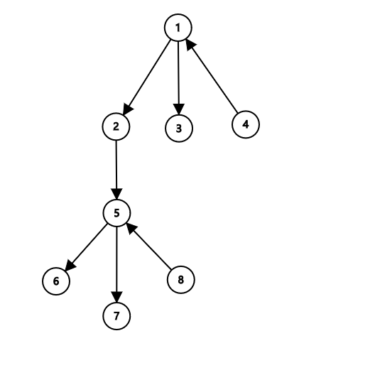 举个例子:我们假设以 号结点为根,并且连接 号结点的边的方向不满足该结论。首先我们通过至多一次翻转操作将整棵树翻转一下使得 号结点所在的子树的边的方向为从深度小的至深度大的。如果当前状态更优,就一定有 。如果存在这样的一个 号结点使得连接 号结点的边的方向像图中这样,那么会有 ,两者矛盾。所以此时一定就不存在这样的 的连接方式。显然,这种情况会在以 号结点为根时讨论到。