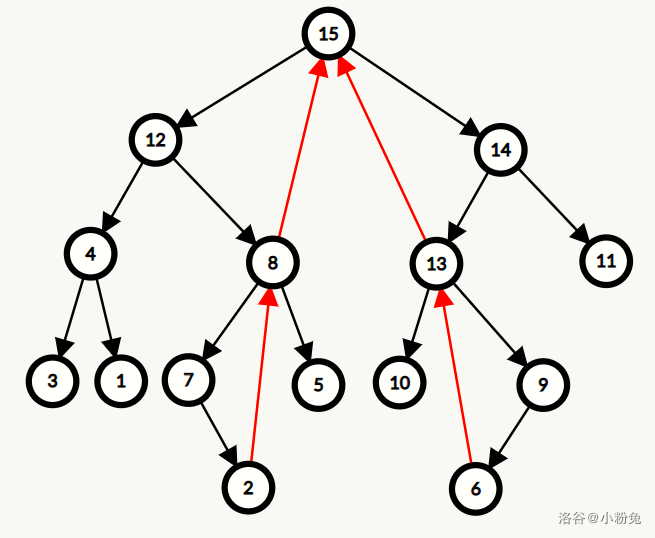 上图为序列 $p = \{3, 4, 1, 12, 7, 2, 8, 5, 15, 10, 13, 6, 9, 14, 11\}$ 的笛卡尔树。
