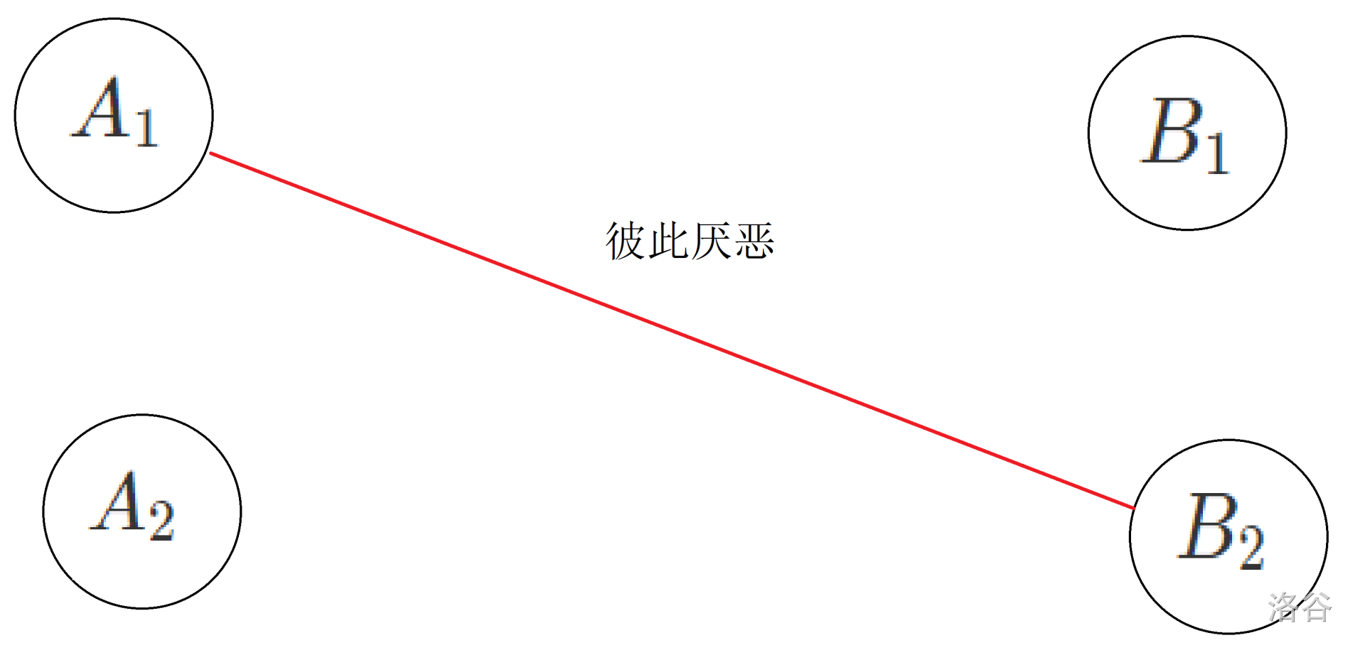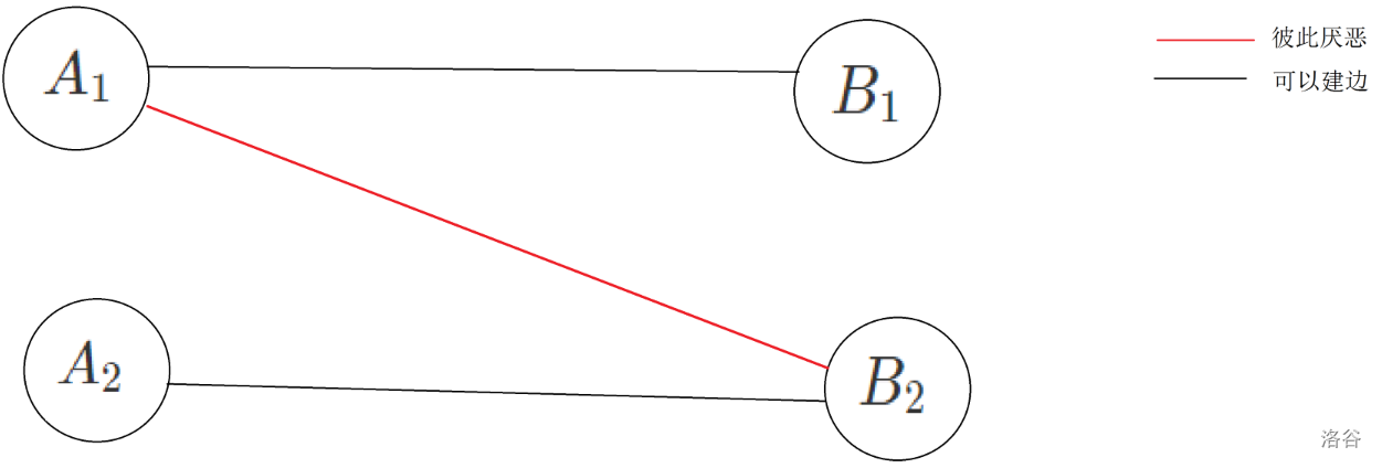 可见,由于有第一个条件的约束,只要将彼此厌恶的双方与对方的搭档连边即可。