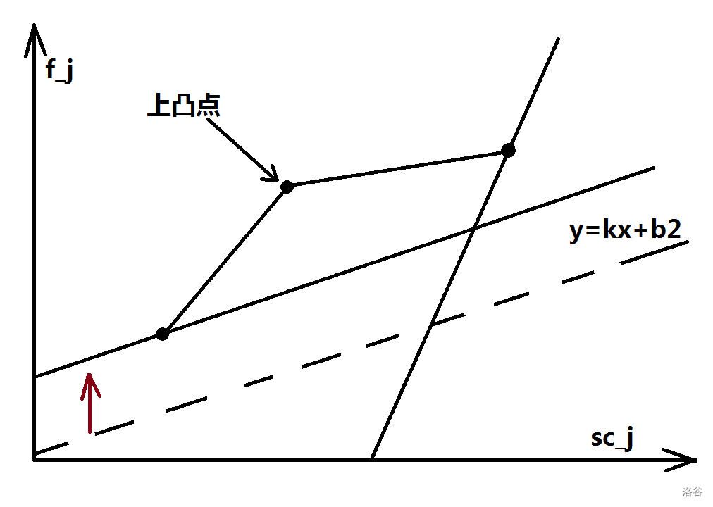 通俗一点讲,所谓选择最优决策点就是把一条斜率为的直线从下向上靠,第一个相交的点就是最优决策点(因为此时最小,也必定最小)。而对于上凸点,无论直线的斜率怎么变化,最先相交的点必定不是上凸点,因此我们可以将所有上凸点都移出决策点队列,最后,我们可以得到一个下凸包。