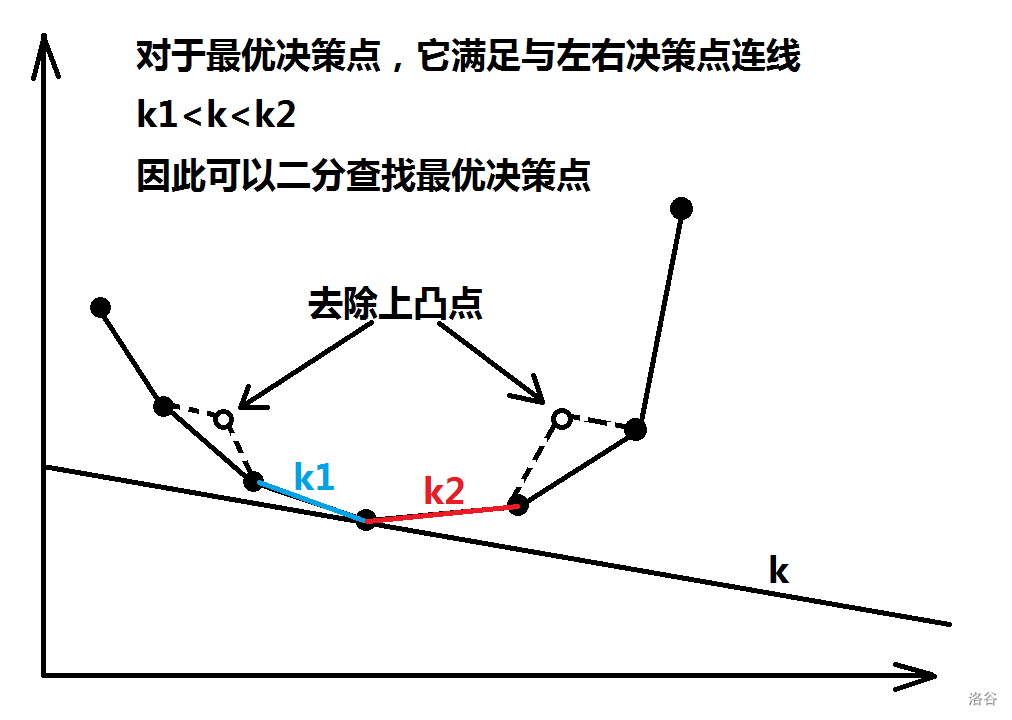 同样,上凸点一定不是最优决策点,因此需维护下凸包。