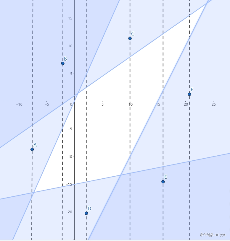 在纸上画一些半平面后容易发现,半平面未覆盖的区域为一个凸包或凸壳,由于凸包和凸壳没有本质区别,为方便表述,下文以凸包为例。