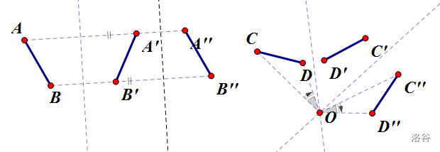 引理 I:两次轴对称相当于一次平移或者旋转;反过来一次旋转或平移可以分解为两次平移或者旋转。