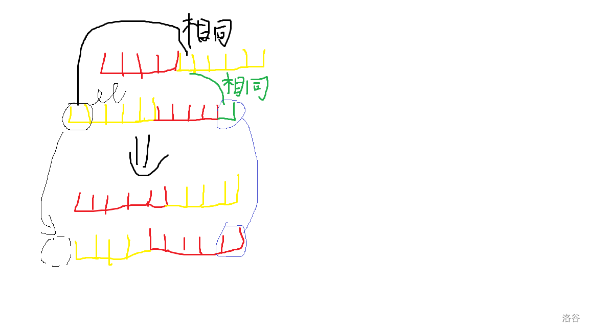 同时,我们发现我们让上文所述的前缀尽可能长是不劣的,考虑我第一个串的那个是第二个串的后缀的前缀向后扩展一位,那么最坏情况下也只是两个串的剩余部分减小一位: