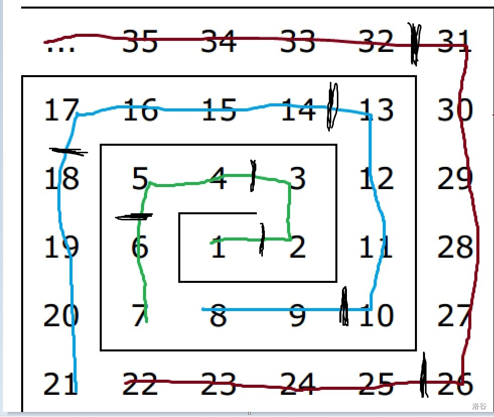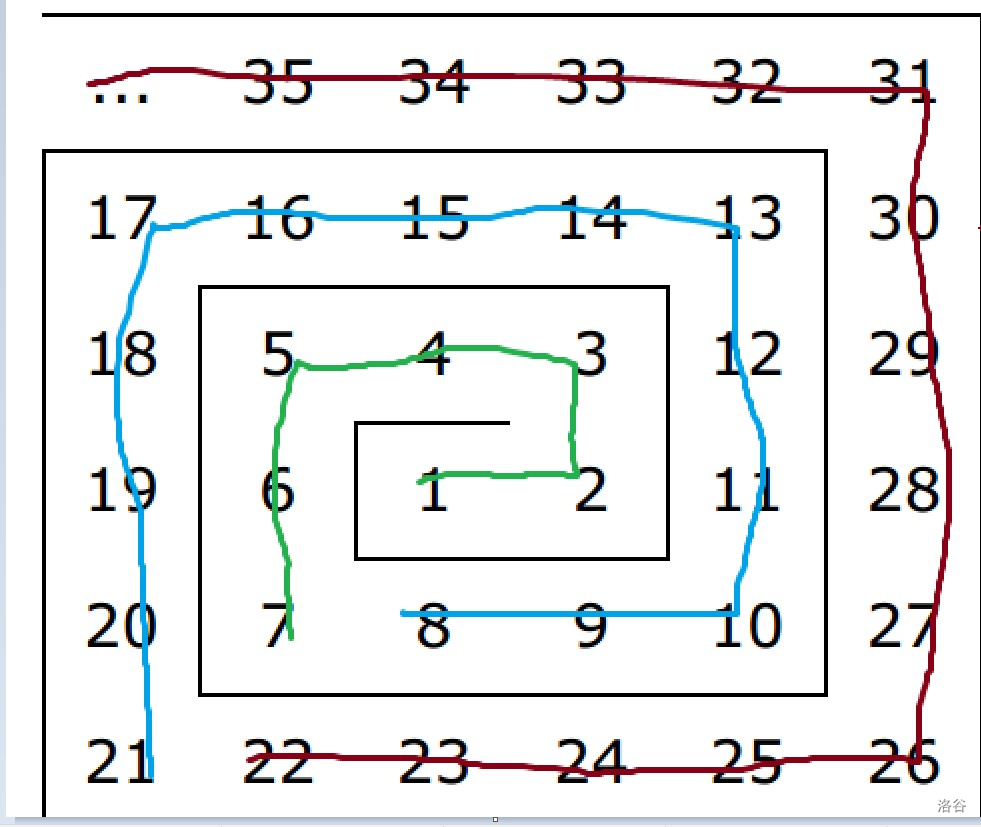 如图,用黑色的线将每一层割成四块,那么除开特殊的第一层,每一层下、右、上、左的块所包含的数量分别为 ,用这样的方法计算,我们可以找出每一层每一块的最小数字(可视为“起点”),从而也可以算出每一层的最小数字和最大数字(即“起点”和“终点”)。