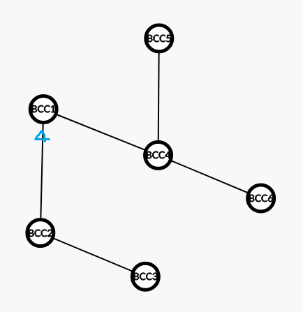 然后考虑外部节点的连接方案数,我们开一个新数组记录。由于外部节点不一定连通,我们得多开一维记录有几个连通块:令 表示由 个节点构成的、有 个连通块的、含 条割边的无向图数量。其实这个 只是 的升级版,多了一维记录连通块数量的 维度,方便转移。瞧,把每个双联通分量看成一个点,就形成了一棵树,像这样: