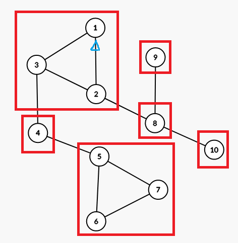回到 ,删除了 所在这个双联通分量后,还剩 个节点 。假设还剩 个连通块 (在上图中 ),则还剩下 个割边 (因为每个连通块贡献一条割边)。留意标斜体的这三处,不正好对应 的三个维度吗?即 。然后外面每个连通块都可以连通到这 个点中的任意一个,所以有 个连接方案。