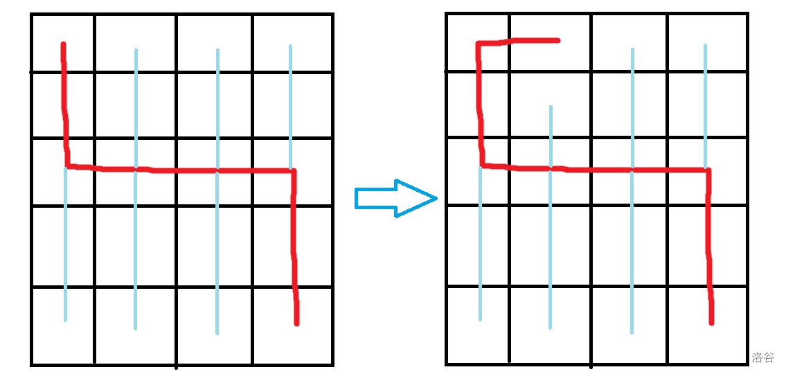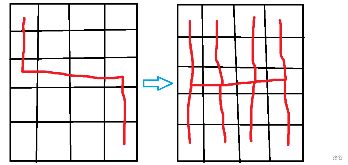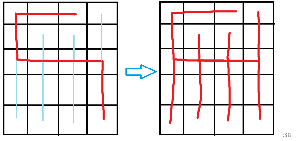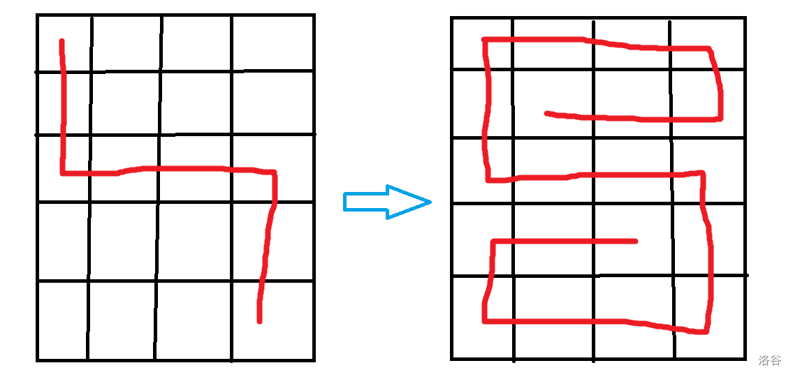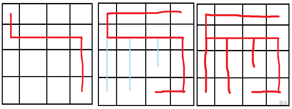 以下的图中每个格子代表一个点,左上角的格子的坐标是 ,右下角的格子的坐标是 ,相邻的格子之间有一条边权为 的边,红色粗线表示的是生成树的边。