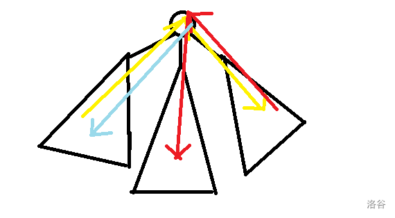 一开始先从黄边走到第三棵子树如果接下来走蓝边的话就和度数为2的情况下一样必然是不增的,假如走红边我们可以用反证法,如果它的长度比第一棵子树里的黄边大,那么它们的长度顺序为第一棵子树黄边第二棵子树红边第三棵子树黄边,那么第一棵子树黄边则是最短的,那么之前第一棵子树的黄边肯定不会选到,选择的节点会在第二棵和第三棵子树之间,他们的深度一定大于第一棵子树的黄边,所以不成立,即第一棵子树黄边第二棵子树红边。