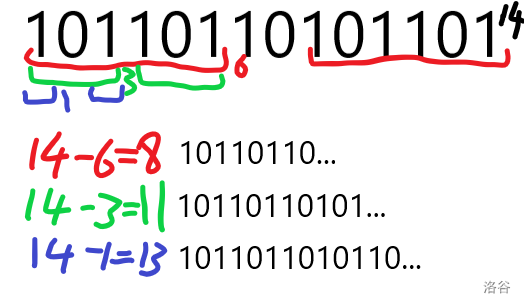 这样类似循环节的性质(注意!对于此处的“循环节”而言,不同点在于字符串长度不一定要是循环节的整数倍,比如